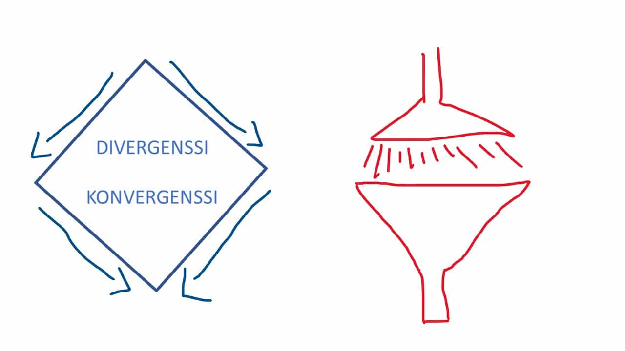 Molempia tarvitaan, mutta luovuudelle divergentti ajattelu on elinehto. Dorte Nielsen ja Sarah Thurber (2020) kuvaavat näitä ajattelutapoja suihku-suppilo-metaforan avulla. Divergenssin idea on ensin laajentaa ajattelua, antaa ideoiden ja ajatusten suihkuta vapaasti. Sitten ideoita ja ajatuksia ohjataan suppiloon, yhdessä arvioitavaksi ja puntaroitavaksi. Suppilosta tulevat sitten ajallaan ulos parhaimman tuntuiset ideat, joita voidaan lähteä testaamaan tosielämässä.